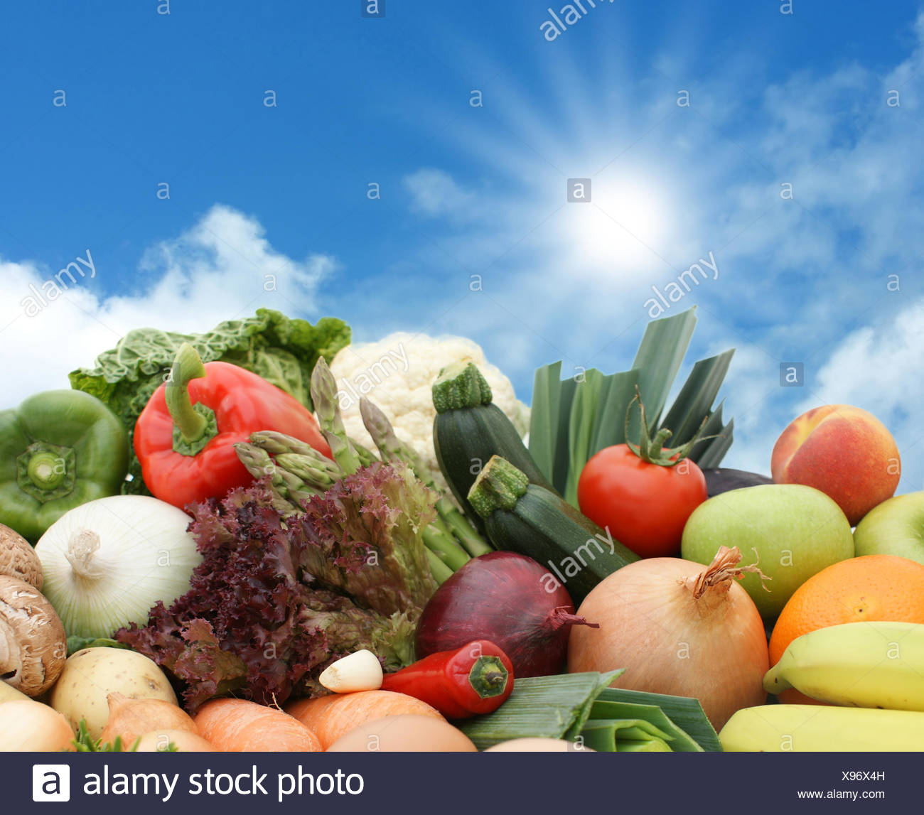 Colorful Fruit And Vegetable Collage Food Background With Assorted
